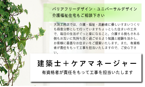 大渕工務店の介護リフォームは、最初から工事完了まで担当者が立ち会います。大工にまかせっきりにはいたしませんのでご安心ください。各分野の専門スタッフ(一級建築士・ケアマネージャー・介護福祉士)が最善のご提案をいたします。![]()