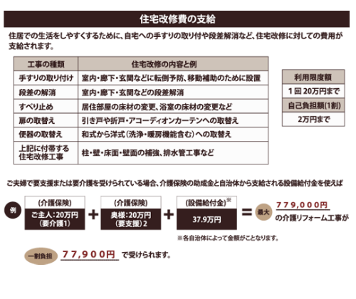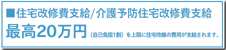 ※原則として被保険者一人20万円を使い切れば終わりですが、転居した場合や要介護度3段階以上あがった場合は、例外的に再度20万円まで住宅改修費が支給される事があります。