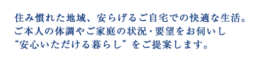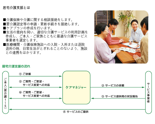 ご本人らしく生活できるようケアマネジャーがご相談しながら、介護サービスなどを組み合わせてケアプランを作成します。サービス事業者と連携し、ご自宅での生活を支援します。