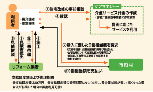 まずは担当のケアマネージャーなどにご相談ください。担当のケアマネージャーが決定していない場合、任意の居宅介護支援事業所に連絡し、ケアマネージャーを決定してください(住宅改修以外に他サービスの利用予定がない場合は、必ずしも契約を行う必要はありません)。