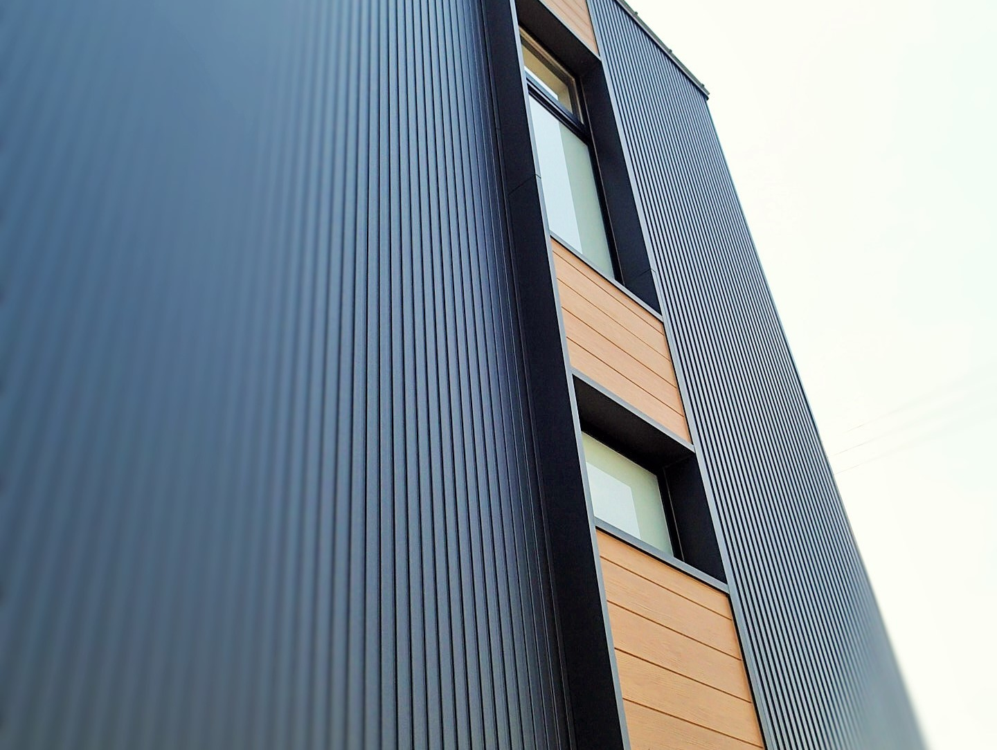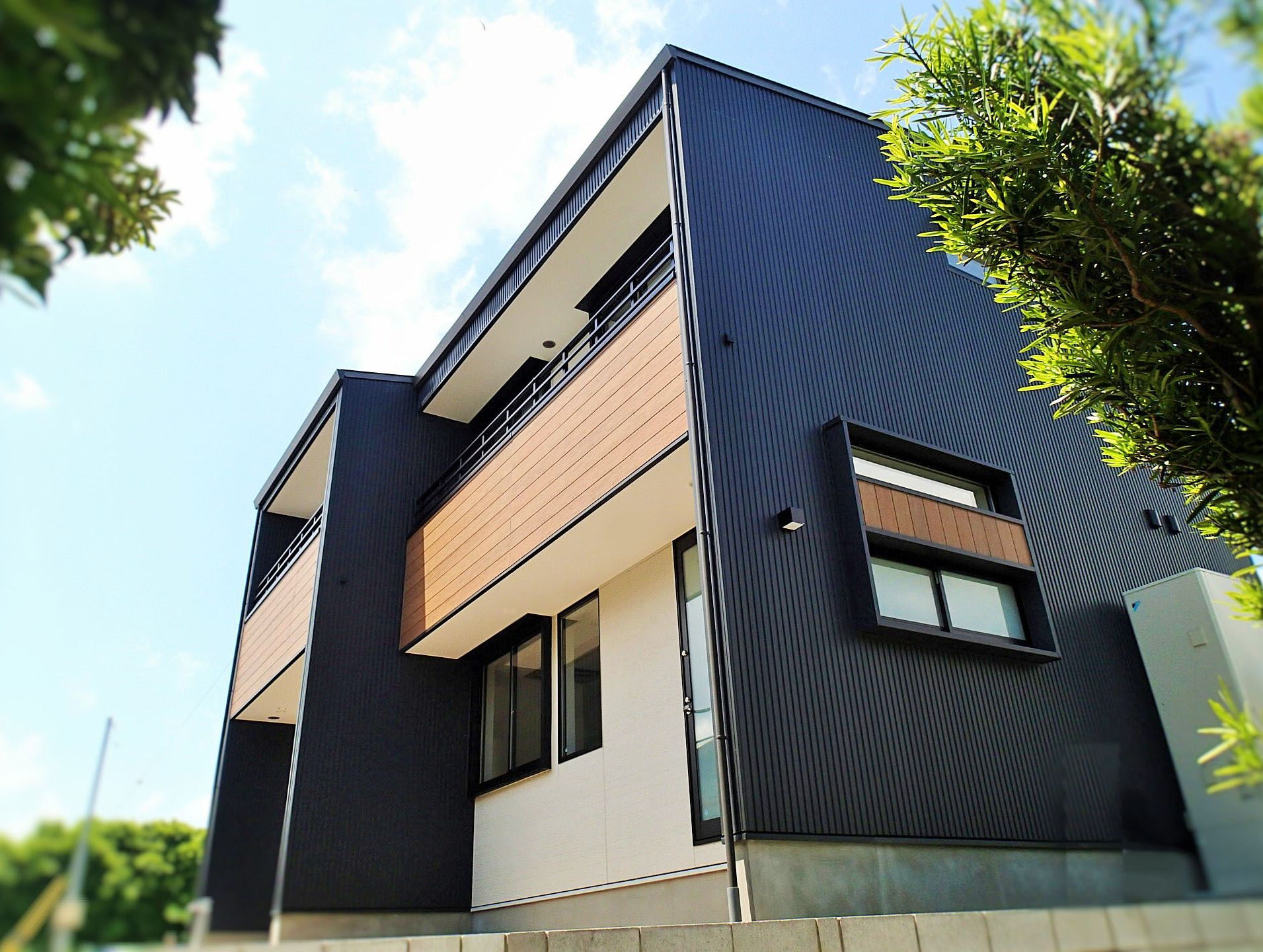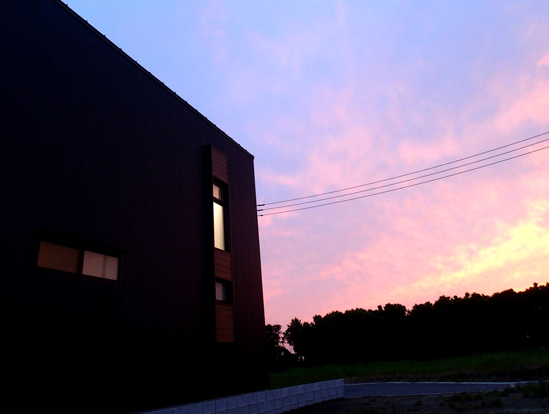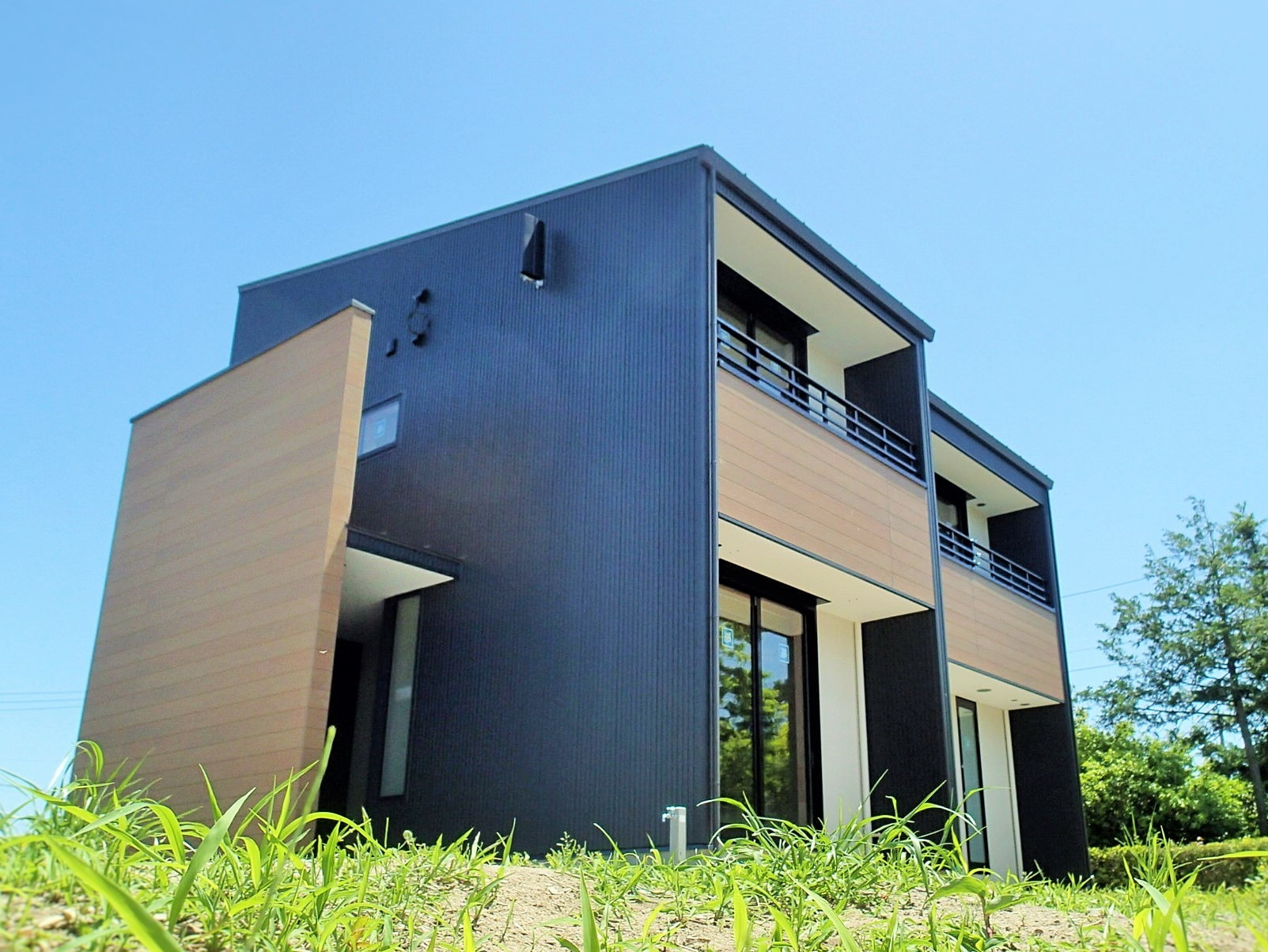 周りは木々に囲まれたのどかな住宅分譲地に計画。南面は景観の開けた好立地であるが、北側隣地及び西側隣地は空きがあるため将来的な部分も考慮した計画が要求された。建物自体のプランニングはシンプルにコストを抑えた計画としたがクライアントのこだわりである「黒」を引き立たせるデザインについてはマテリアルからディテールまで徹底的に検討した。また「黒」における素材のメンテナンス性にも配慮した結果ガルバリウム鋼板の外装材をを採用した。「Black&Wood」と呼ぶにふさわしく人目を惹くクライアント自慢の住宅がここに完成した。