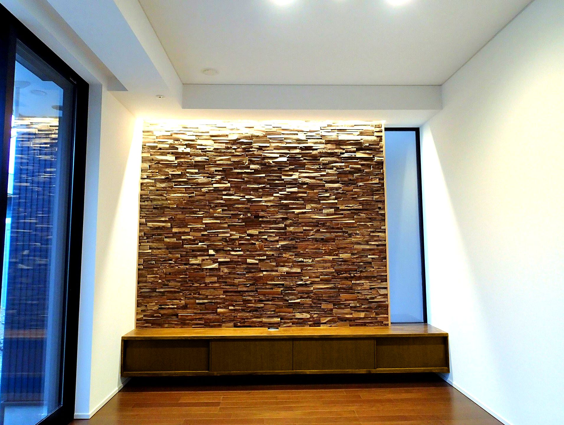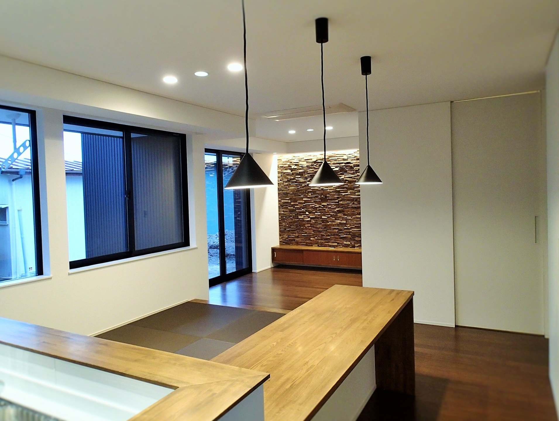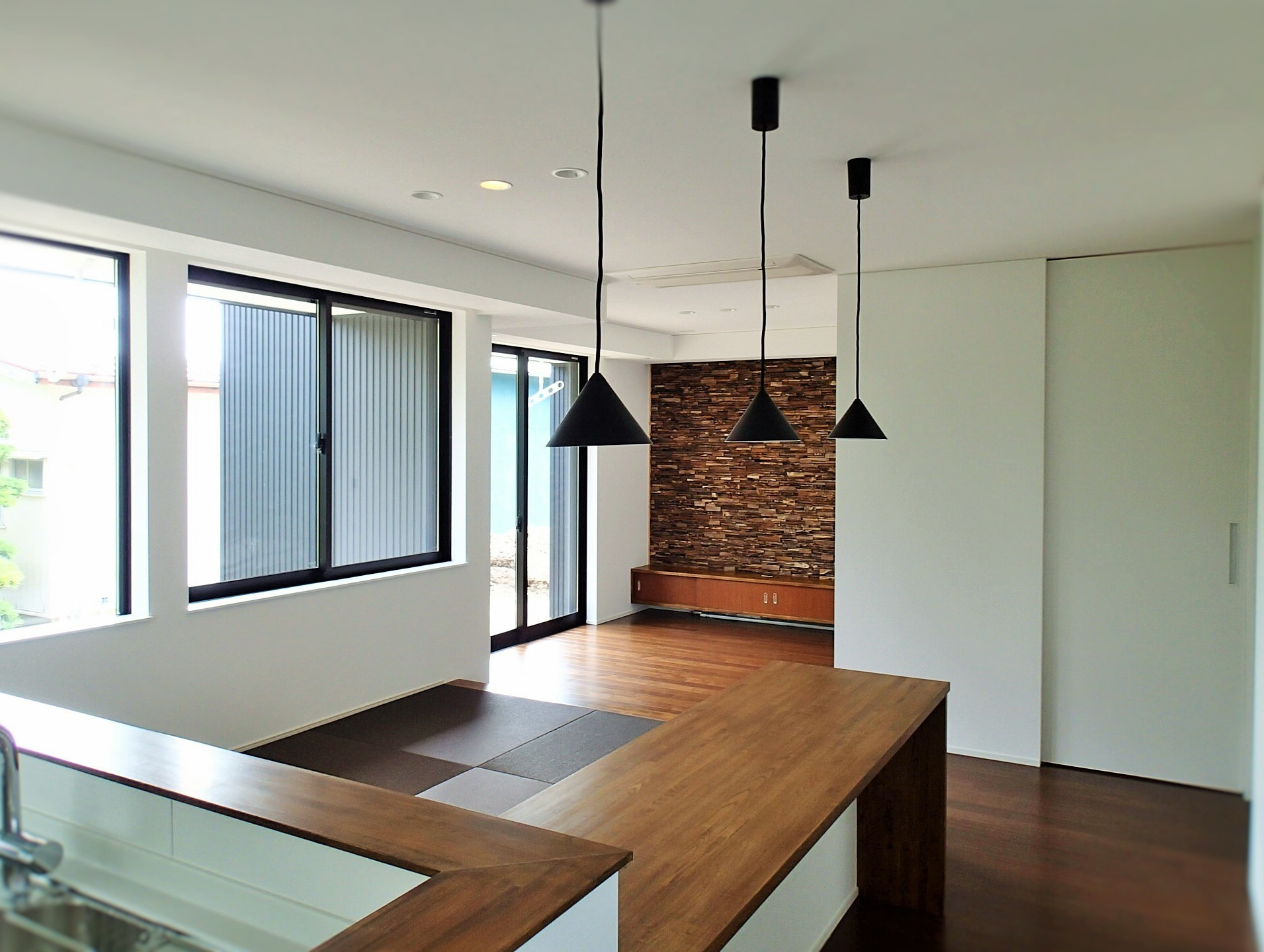 周りは木々に囲まれたのどかな住宅分譲地に計画。南面は景観の開けた好立地であるが、北側隣地及び西側隣地は空きがあるため将来的な部分も考慮した計画が要求された。建物自体のプランニングはシンプルにコストを抑えた計画としたがクライアントのこだわりである「黒」を引き立たせるデザインについてはマテリアルからディテールまで徹底的に検討した。また「黒」における素材のメンテナンス性にも配慮した結果ガルバリウム鋼板の外装材をを採用した。「Black&Wood」と呼ぶにふさわしく人目を惹くクライアント自慢の住宅がここに完成した。
