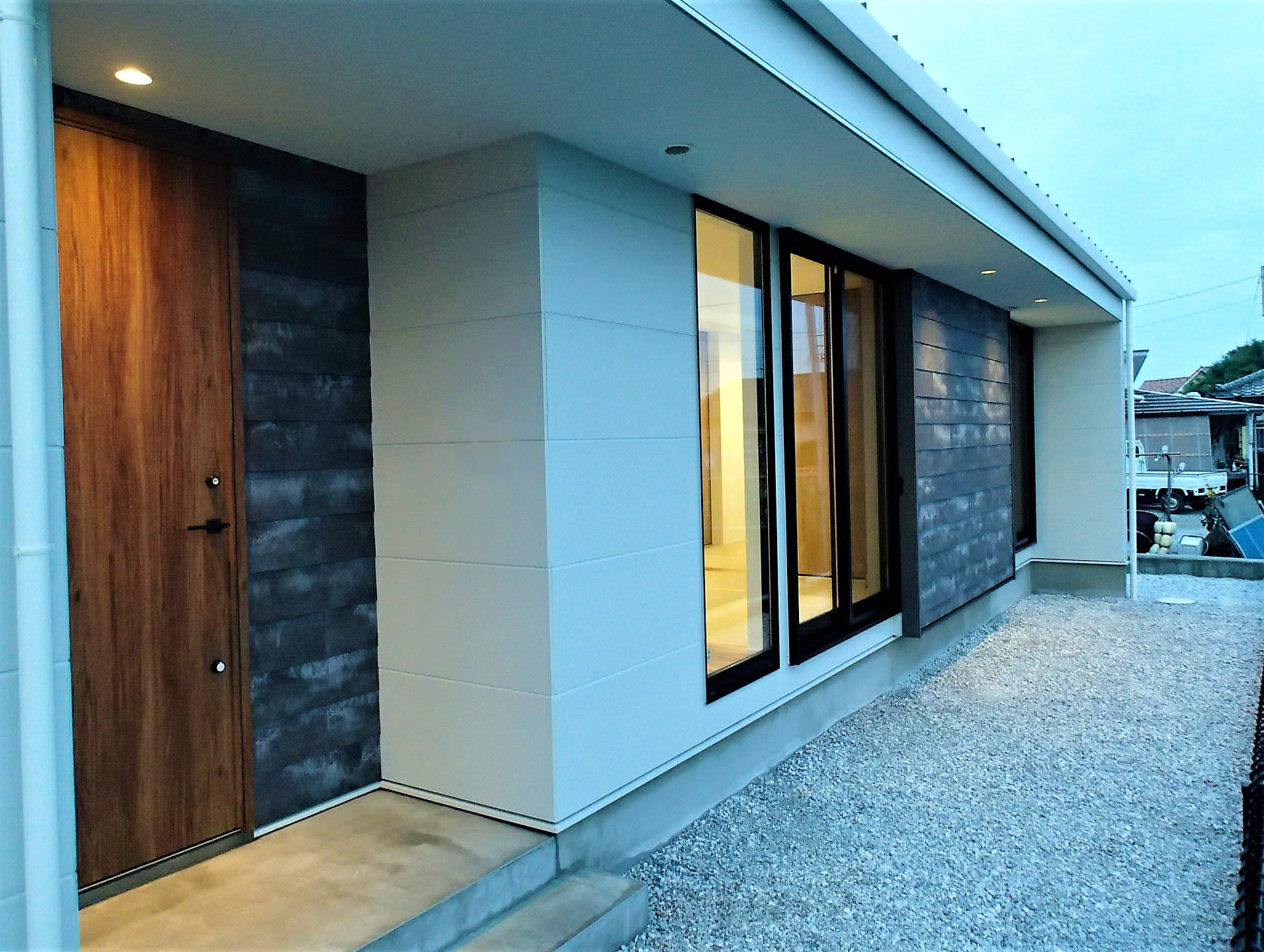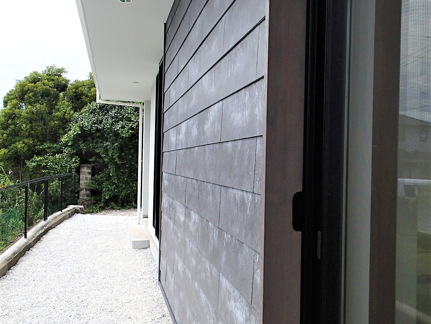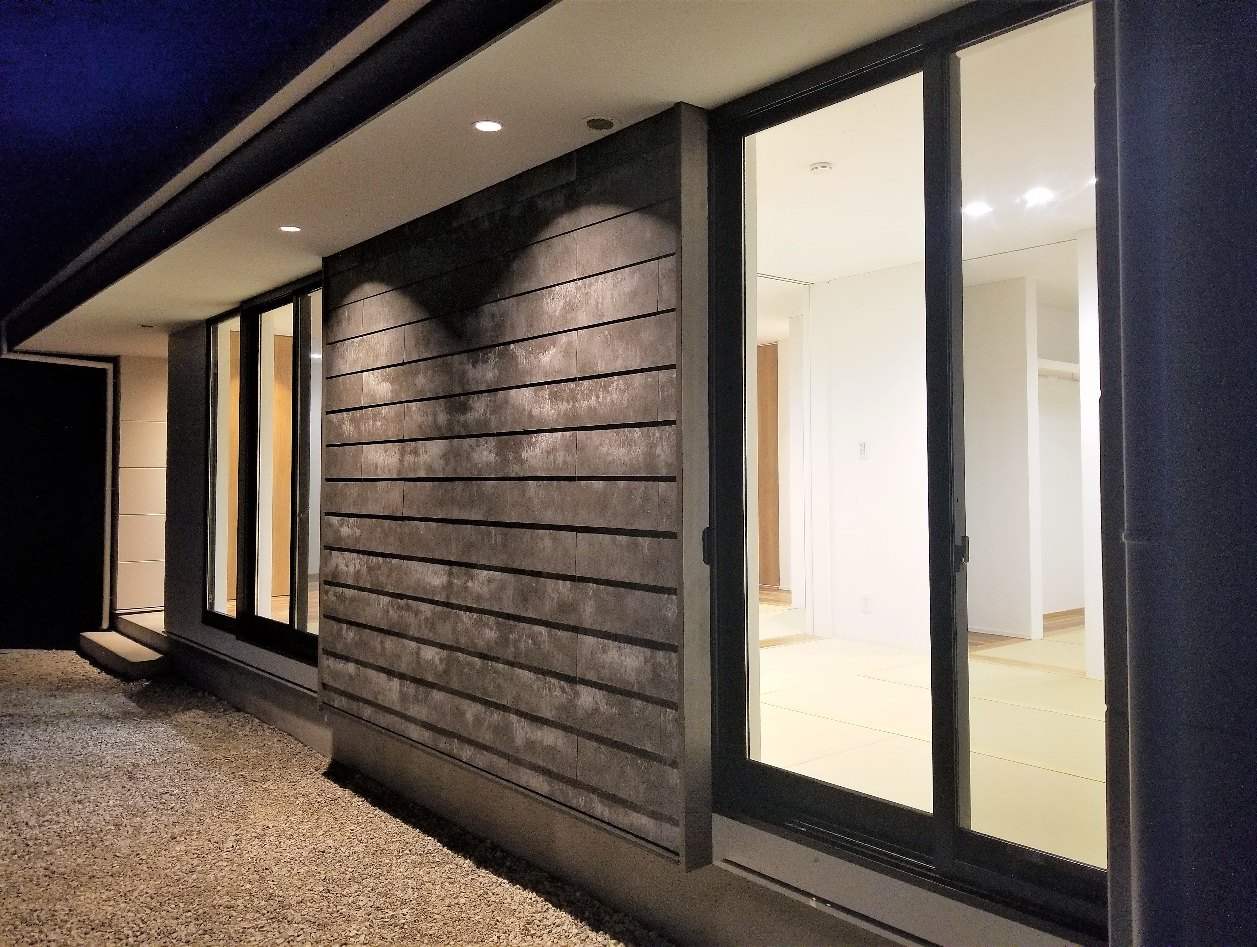 当該敷地の地盤は地表20㎝から岩盤が露出した為基礎工事は難航したが、掘削した岩盤を砕き細かくし庭の砂利替わりに再利用することで外構費用に配慮しつつ岩盤という珍しい素材が訪れる人を楽しませてくれる趣となった。(アプローチ部分)