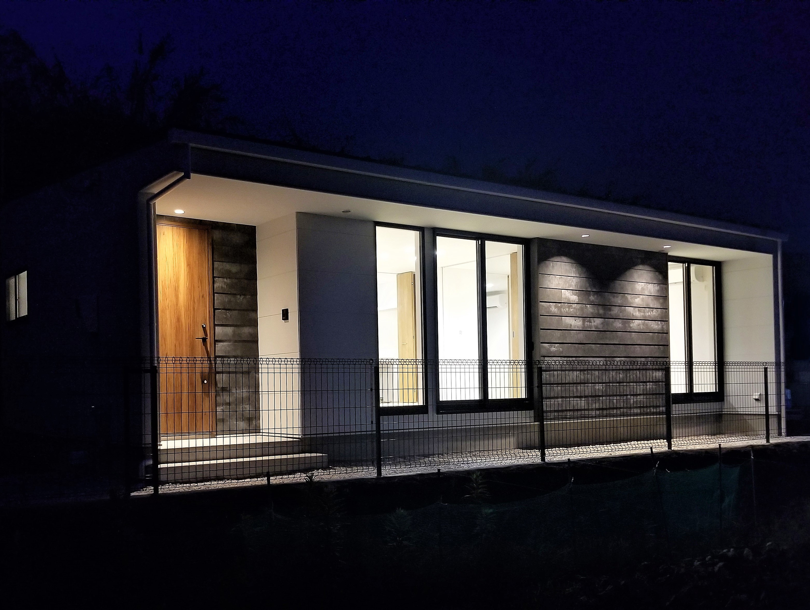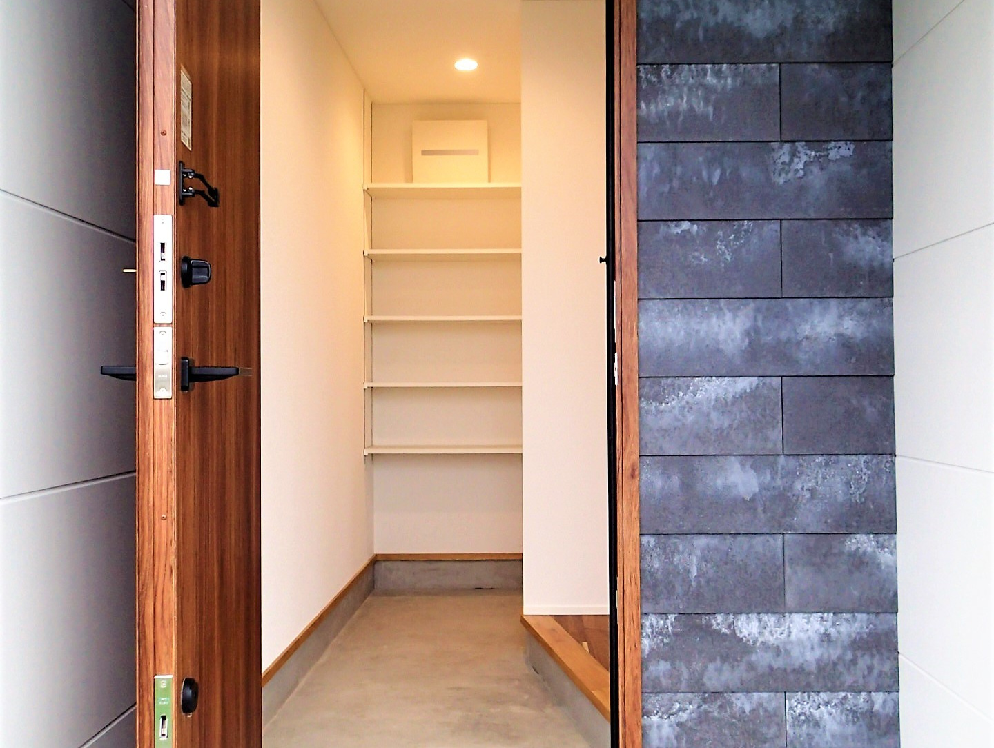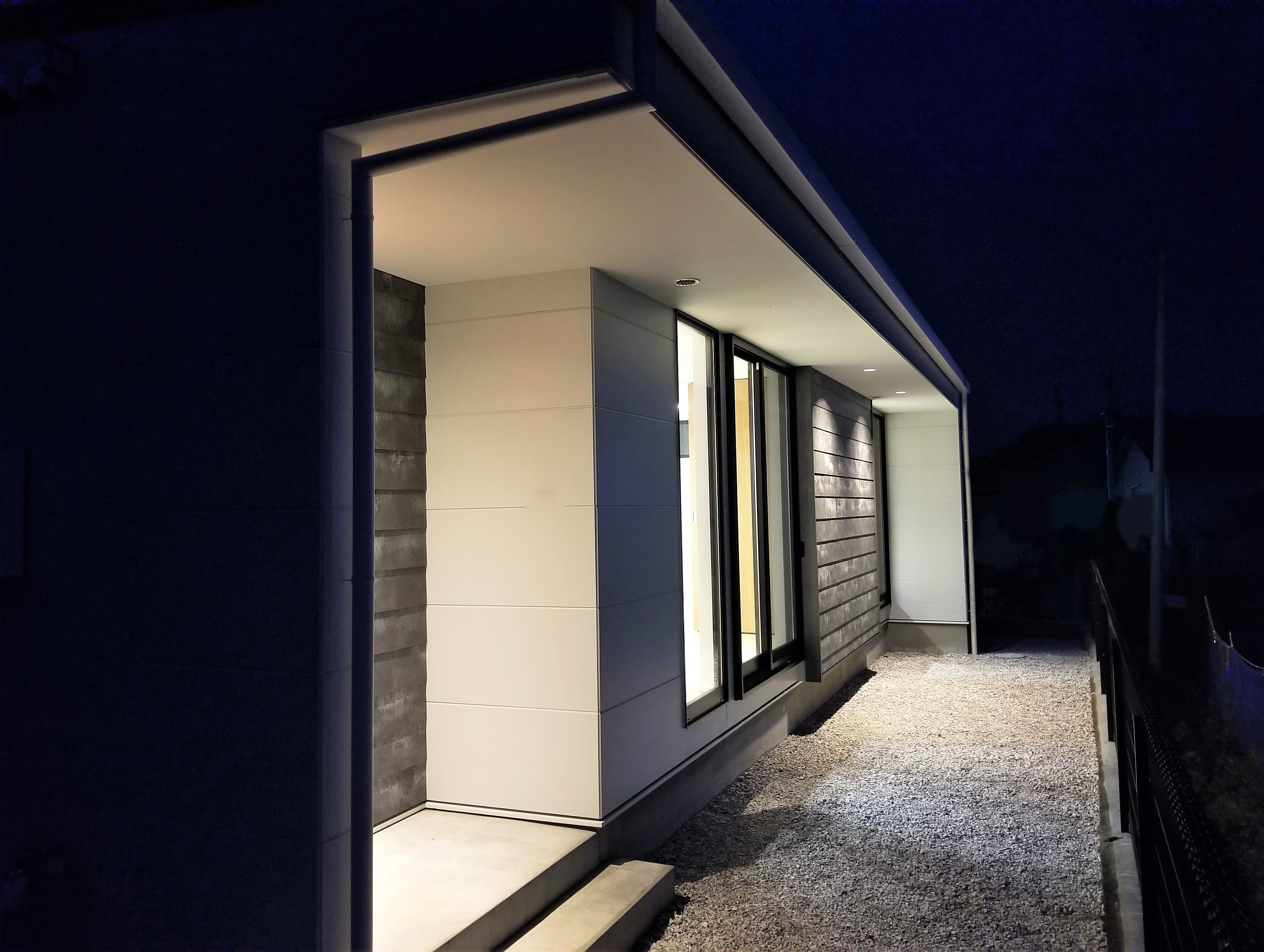 当該敷地の地盤は地表20㎝から岩盤が露出した為基礎工事は難航したが、掘削した岩盤を砕き細かくし庭の砂利替わりに再利用することで外構費用に配慮しつつ岩盤という珍しい素材が訪れる人を楽しませてくれる趣となった。(アプローチ部分)