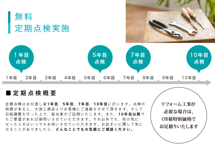 片道1時間のエリア内で施工させていただいております。建築するということは、その後の末永いお付き合いをお約束することです。
