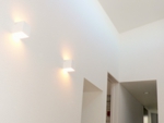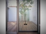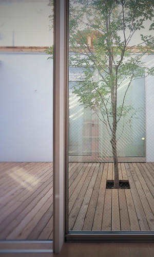 敷地の南西側前面道路(国道)より1.5m程度の高低差があり周辺及び隣地からのプライバシーを確保したいという要望から中庭を臨める「コートハウス」を計画しました。各部屋から中庭を結ぶことで、夏特有の南西風を各部屋に導くことで快適かつプライバシーに配慮した計画としました。更に北側よりハイサイドライトを設け建物の暗くなりがちな中枢域にもやわらかな、採光を確保しました。