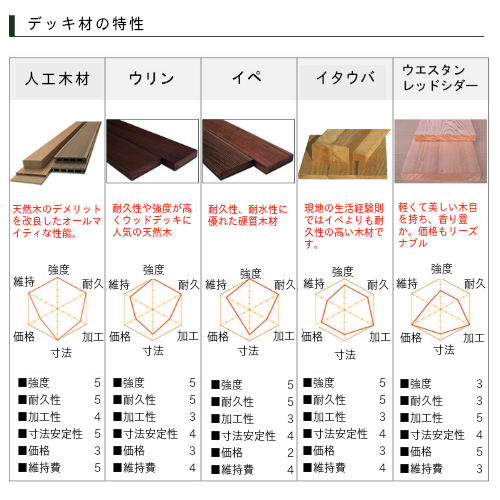 人工木材>イペ、ウリン>ウエスタンレッドシダー>ホワイトウッド、SPF(スプルース・パイン・ファー)