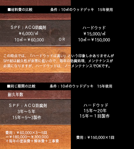 さ(手間)並びに消耗品に対する経費等が違います。ウッドデッキに使われる代表的な木材とし