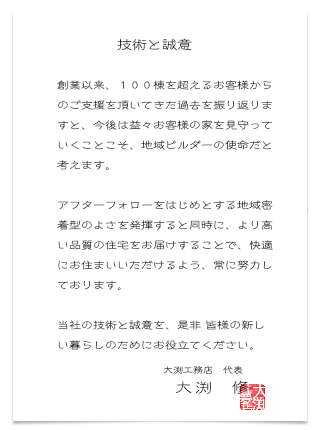 大渕工務店は昭和57年に営業を始め以来、木の家つくりを生業として地元館山市を中心として仕事をしてきました。現在までに数多くの家及び建物をつくり、30年以上の年月を経過して現存する家も数多くあります。さらに保守点検を継続的に行っている家も数多くあります。あたりまえの事だと言われそうですが家は建てたら終わりではありません。家をつくった工務店が定期点検を行い、維持管理のアドバイスをしながら必要に応じて改修、リフォームを行います。そうして、家がある限りは住まい手が安心快適に暮らせるように家を守り続けていくのが工務店としての使命だと考えています。